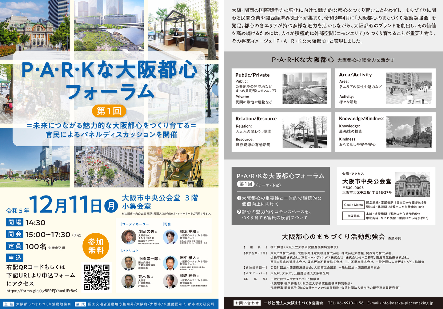 令和5年12月11日(月)に大阪市中央公会堂小集会室におきまして、未来につながる魅力的な大阪都心をつくり育てることを目指し、官民によるパネルディスカッション「P・A・R・K な大阪都心フォーラム開催=第1回=」を開催しました。フォーラムでは、国、地方自治体、民間企業、有識者のそれぞれの立場からまちづくりからまち育てに関する現状や課題などを発表し、官民共創による大阪ならではの都市経営の実践を目指すべく、意見交換を行いました。